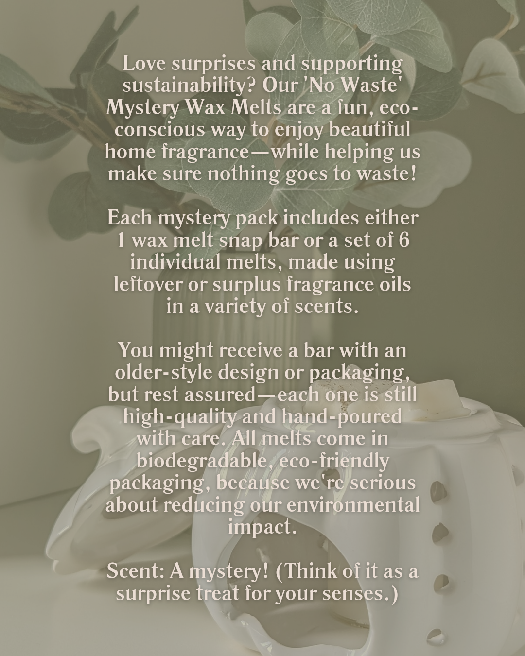 Love surprises and supporting sustainability? Our 'No Waste' Mystery Wax Melts are a fun, eco-conscious way to enjoy beautiful home fragrance—while helping us make sure nothing goes to waste! Each mystery pack includes either 1 wax melt snap bar or a set of 6 individual melts, made using leftover or surplus fragrance oils in a variety of scents.